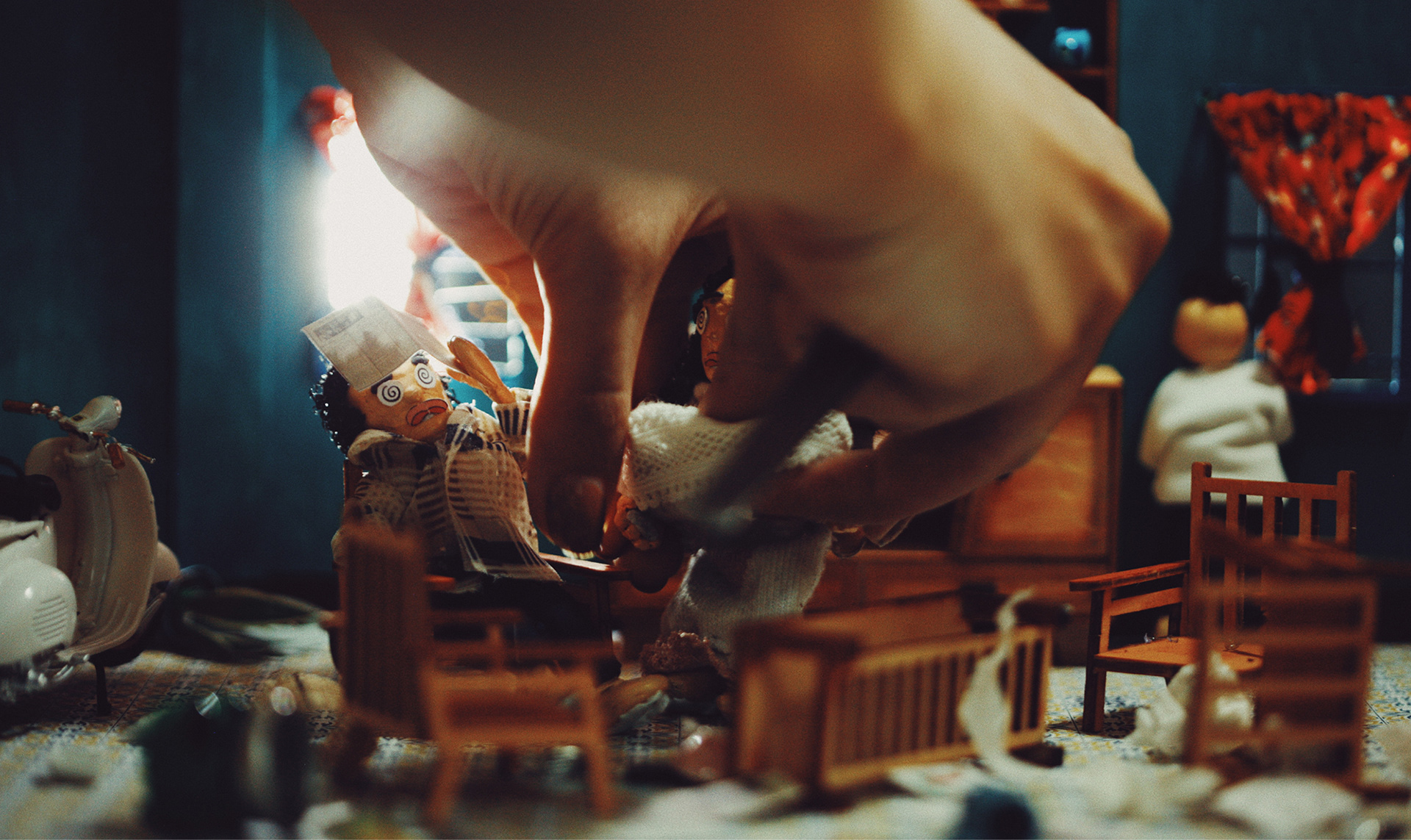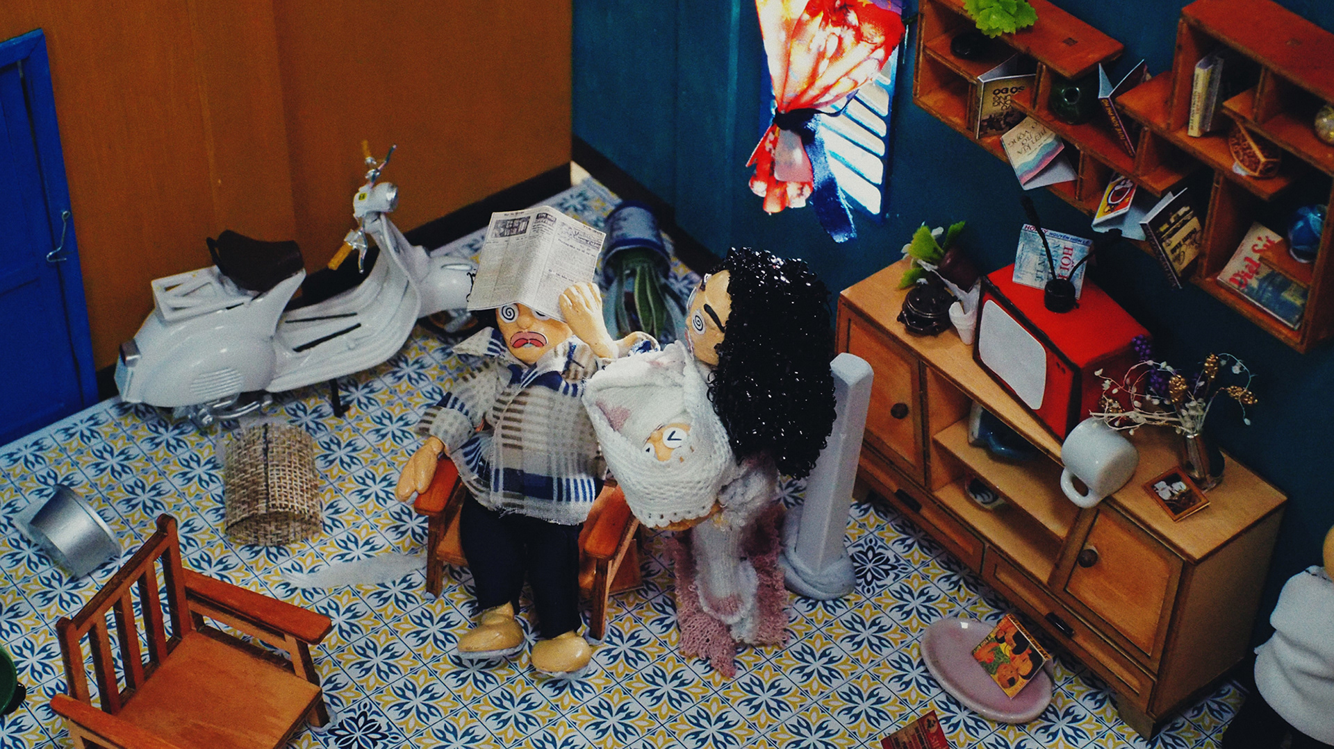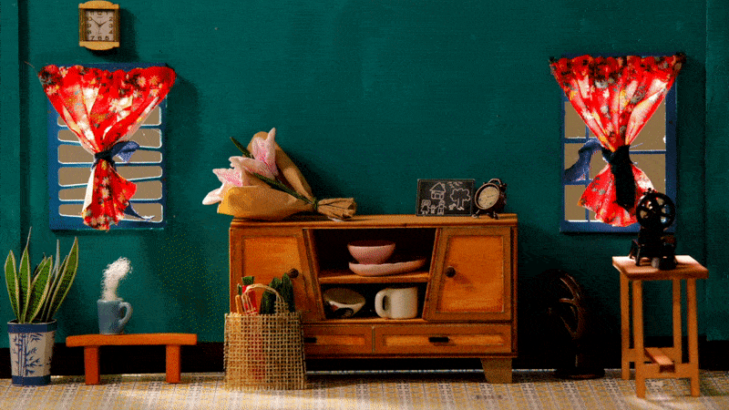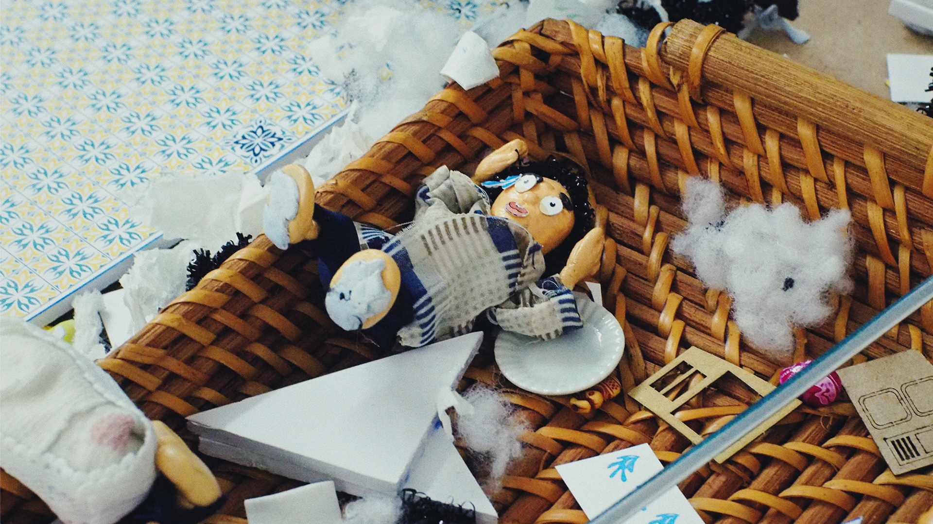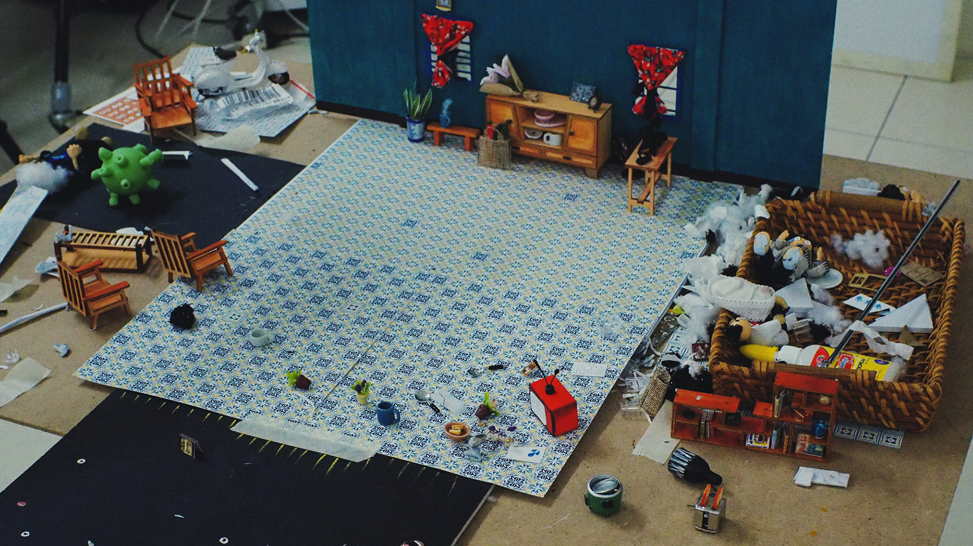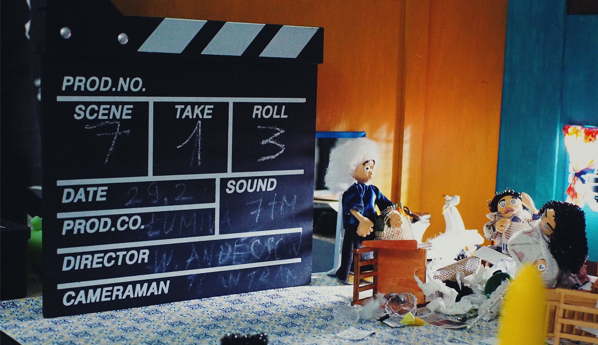 The set is smaller than an usual stop motion set, 30×35 centimeter, we have to very careful to move the charaters and stuffs around without changing the current set up. What a tough job for people with big hand pawns.
